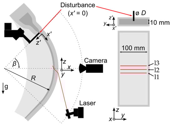 Stable wave structures were generated by an artificial disturbance at the nozzle outlet. This disturbance was a metal cylinder with different diameters D (1.2, 2, 3 mm). The penetration depth of the cylinder into the water could be varied by a linear stage. A camera (“Basler ac2040-55uc” camera [18] and “KOWA LM16JC3M2” objective [19]), placed as depicted in Figure 4 with a back wall distance of 213 mm, was used to observe the wake structures with an exposure time of 1 s. To measure the layer thickness, a laser line was projected in the camera’s field of view. The camera observed three reflected lines from the channel outside wall (l1), the channel floor (l2) and the water surface (l3). Figure 4 shows the arrangement of the disturbance, the camera and the laser, as well as the view on the channel back wall with the three reflected lines. To measure the height profile at different positions, the camera and laser could be moved by keeping a constant distance to the back wall. The relative position of the laser and camera remained constant. The measured circumferential positions were β = 35°, 40°, 45° and 50° downstream of the nozzle. The vertical channel position corresponded to β = 45°.