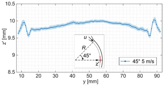 To validate the measurement system, the layer thickness in the area 0–2 mm downstream of the nozzle was measured. The expected thickness was the nozzle height of 10 mm. The average layer thickness along the channel width was 9.99 mm, with a standard deviation of <0.09 mm. In addition, undisturbed profiles were measured with a chromatic confocal sensor (KEYENCE CL-3000 with CL-LP070 optical head [21]). The mean deviation of the undisturbed absolute height profile in between the side wall wakes measured by the two sensors for β = 45° (u = 5 m/s) was smaller than 0.1 mm.