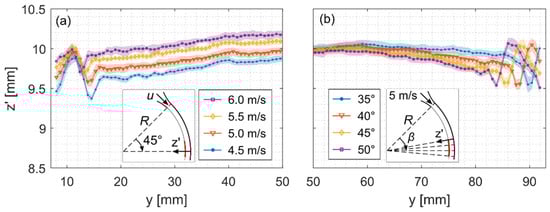 (a) Height profiles at the vertical channel position β = 45° at different flow velocities u. (b) Height profiles at u = 5 m/s at different circumferential positions (β).