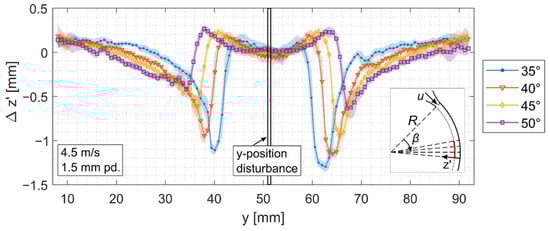 Relative height profile at u = 4.5 m/s for four different circumferential positions (β). The disturbance had a diameter of D = 1.2 mm and a penetration depth of 1.5 mm.