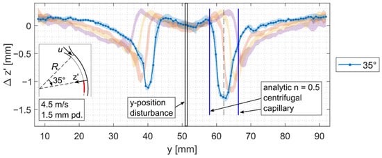 Only the circumferential position had an impact on the position of the wake minimum (Figure 7). This was consistent with the analytical results. The position of the dominant wake minimum was between the innermost capillary and outermost centrifugal line. The solution for n = 0.5 represents the position of the first maximum. Figure 8 shows the position of the analytical results β = 35° downstream of the nozzle in comparison to the measured profile. From the definition of the analytical solution, there are no further solutions defined for n < 0.5. Nevertheless, the experimentally measured position of the minimum was described by the centrifugal solution with n = 0.25 (vertical dashed line in Figure 8).