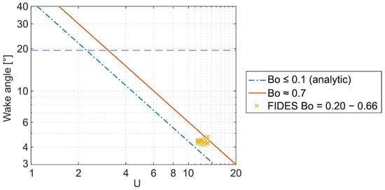 Wake angle plotted against velocity ratio U following Moisy and Rabaud [10]. The horizontal dashed line is the Kelvin angle 19.47°. The lower diagonal line is the wake angle curve corresponding to small Bond numbers (Bo ≤ 0.1). The upper diagonal is a fit for Bo ≈ 0.7. Measured wake angles in FIDES are represented by the yellow crosses.