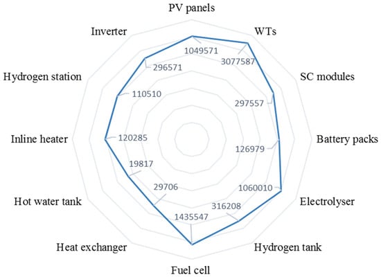 where , , , , and denote the optimum capacity, capital cost, replacement cost, operation and maintenance cost, and salvage value of the component, respectively; is the single payment present worth; stands for the capital recovery factor; denotes the real interest rate per annum (6%); and is the expected lifespan of the MECM system (20 years).