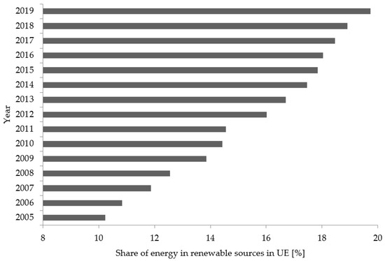 Figure 1 shows the percentage share of renewable energy in the total energy production in the European Union in 2005–2019. Within 14 years, the share of renewable energy has doubled, from 10% in 2005 to almost 20% in 2019. Sweden has the highest percentage of renewable energy among the Member States of the European Union. In 2019, 56.4% of Sweden’s energy was produced using renewable energy sources (hydropower, wind, photovoltaic and biofuels). Of all European countries, including those not belonging to the European Union, Iceland has the highest percentage share of renewable energy—78.2% (hydropower and geothermal).