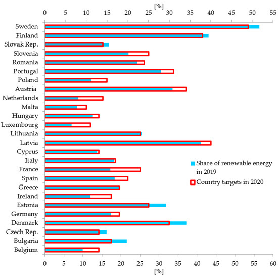 According to Directive 2009/28/EC of the European Parliament and the European Council, the aim for 2020 was to achieve a 20% share of renewable energy in total energy production and a 10% share of renewable sources in EU transport sectors. In order to achieve a 20% share of renewable energy in the total energy production in the European Union, individual Member States have set up specific targets that should be achieved by 2020. Figure 2 shows the targets set up by specific Member States and their degree of fulfilment in 2019. Sweden, Finland, Slovakia, Romania, Lithuania, Latvia, Cyprus, Italy, Greece, Estonia, Denmark, the Czech Republic and Bulgaria have already met the targets. Portugal, Austria, Hungary and Germany were close to meeting the targets in 2019 (less than 1% to meet the target).