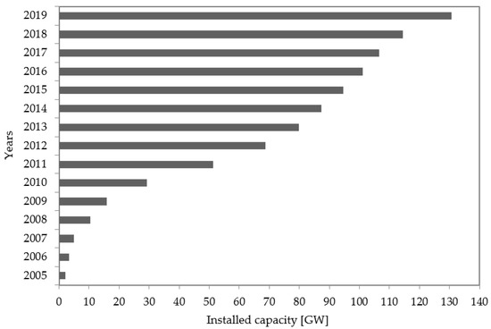 The EU 2020 Climate & Energy package targeted an increase in the share of renewable energy sources up to 20% in EU countries [5]. Therefore, investments in renewable energy sources are necessary [6,7,8,9,10,11,12,13,14]. Solar energy is a major renewable source to generate electricity through photovoltaic cells [15,16,17]. Due to various types of subsidies, a large increase in installed capacity in photovoltaic installations has been recorded [18]. Figure 3 shows a rapid increase in the photovoltaic installed capacity in the European Union in the period 2005–2019.