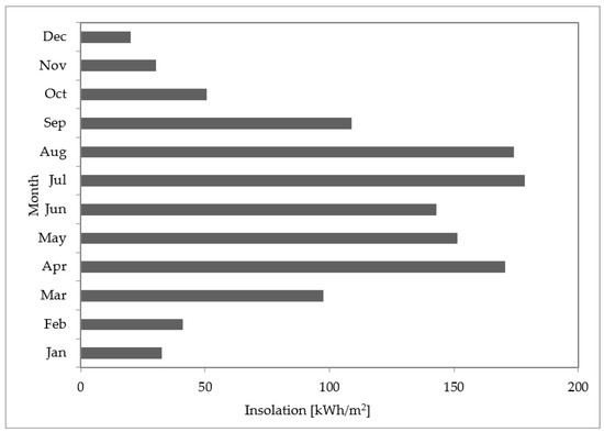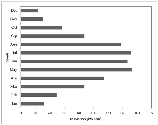 Taking into account the average daily intensity of solar radiation and the number of days in a year, the program determined total annual insolation as 1070 kWh/m2. The highest value of insolation was in May and amounts to 153.14 kWh/m2, while the lowest value was in December and amounts to 24.18 kWh/m2.