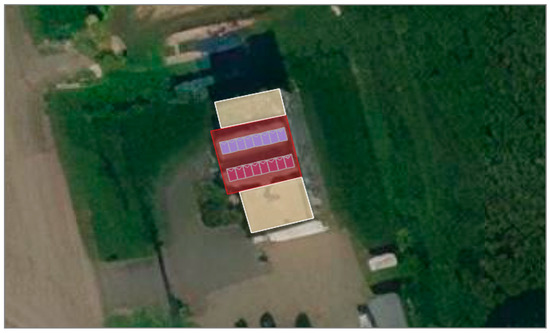Figure 6 shows the designed installation as described in the BlueSol program. Due to the flat roof, the photovoltaic panels are designed on metal structures at an angle of 13 degrees.