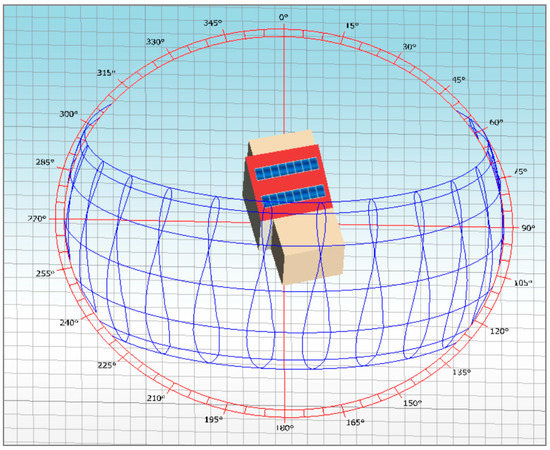 Figure 7 shows the azimuth of the designed building and the path of the sun (blue line), which shows the altitude of the sun during the year, which makes it possible to calculate the shading of the installation by neighbouring buildings, trees, or chimneys.