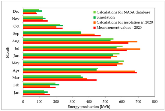 A comparison of the value of insolation and electricity production is shown. Using formula (1), it is possible to calculate the energy production during the year with high accuracy, without the need to use specialised software. The difference between the solar calculations from NASA’s database and the PV installation design software is 24.8 kWh per year, which is a difference of 0.6%. In the case of calculations using data from measurements at the research station for 2020, the calculated annual energy produced is lower by 31.9 kWh compared to the actual data, which is a difference of 0.66%, as shown in the Figure 13 and Figure 14.