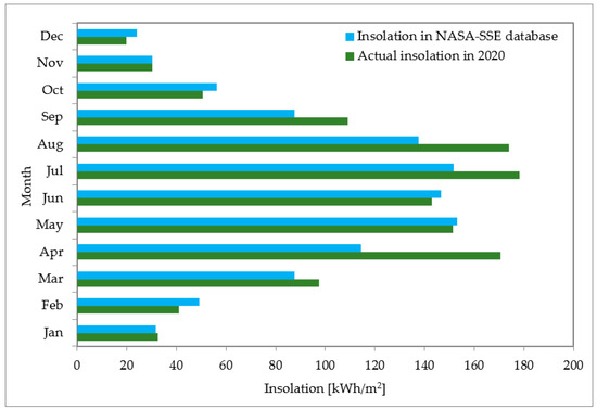 The total annual insolation in 2020 was 1198.12 kWh/m2, which is 12% higher than the data given in the NASA-SSE database.