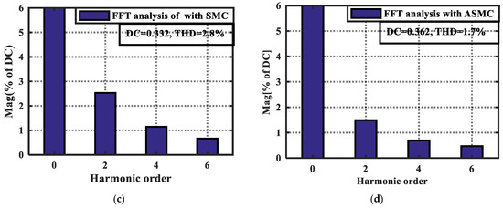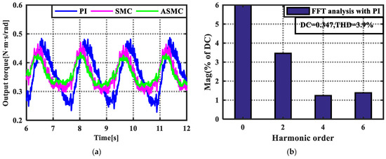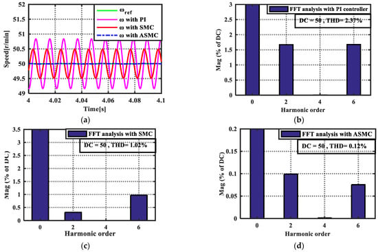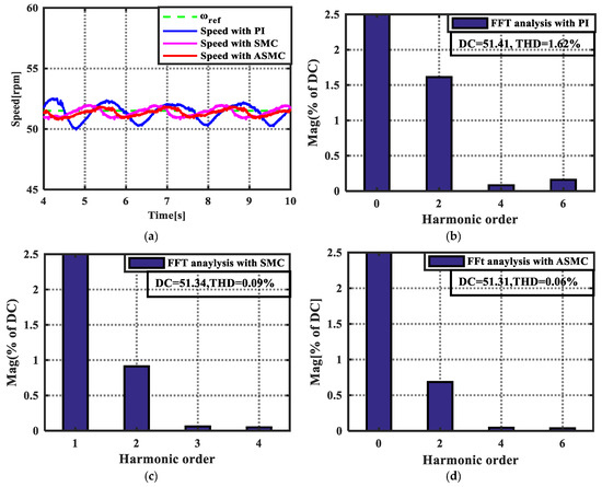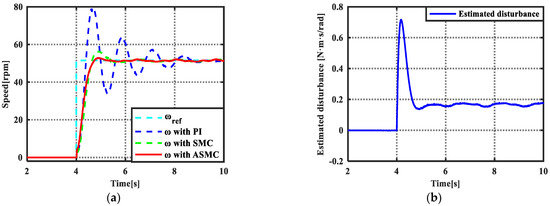 - SMC: the parameters of the SMC are designed as , , and . For the sake of an impartial comparison, a low pass filter is added the reference input to obtain the same dynamic response with 98% ωref with the PI controller. The time constant is selected as 0.08 s.