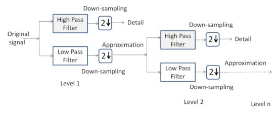 The discrete wavelet transform (DWT) is a method used with time series for analyzing or denoising purposes. The basic idea of the DWT algorithm is feeding the original signal to a high pass filter and a low pass filter simultaneously, using a downsampling algorithm. This yields two components of the signal; low-frequency content (called approximation) and high-frequency content (called detail). The process is repeated on the approximation coefficients several times equal to the desired level of decomposition. After thresholding, the signal is reconstructed using the inverse wavelet transform to yield the denoised PD signal [38]. Figure 1 shows this process [39].