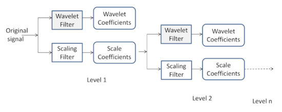 where X is the signal, K is the number of samples, j is the decomposition level at time i, h and g are the wavelet and the scaling filters, respectively, and is the width of the level filter.