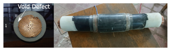Tested 132 kV cable sample. The outer jacket, sheath, and semi-conductive screen were removed from the sides. A void in the radial direction of the cable was created.