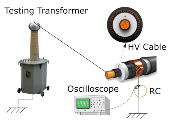 Laboratory setup. A testing transformer is connected between the cable conductor and the sheath. A Rogowski coil is connected across the connection with the sheath.