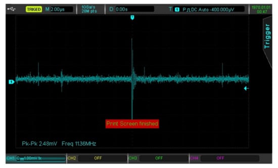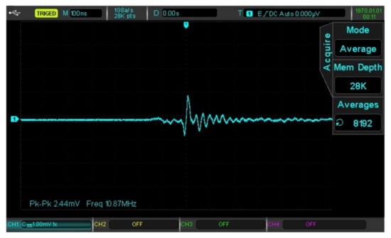 Figure 6 shows the acquired PD signal that is generated, due to the presence of a void inside the insulation of the cable. It appears as multiple pulses along the span of the power cycle. Although the acquired signal has some white noise superimposed on it, the PD pulses can be distinctively seen since the noise amplitude does not exceed 10% of the PD pulse amplitude. By zooming on one of those pulses, those pulses clearly appear in the form of damped oscillations as shown in Figure 7. This PD type was the common type generated, due to the internal cavity defect inside power cables, which was detected using an inductive sensor, i.e., RC or HFCT [41,42,43]. By running multiple tests, it was found that the amplitude of those pulses ranged from 1 mV to 2.5 mV with the frequency detected by the oscilloscope ranging between 10 MHz to 12 MHz, so 11 MHz was selected for the computer-generated PD pulses.