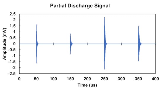 This computer-aided replication further serves the purpose of generalizing the PD signal to include different insulation defects in terms of size, shape, and location, and thus, strengthens the findings of this paper. The simulated PD signal is shown in Figure 9. It is made up of four pulses with amplitudes of 1.5 mV, 1 mV, 2.5 mV, and 1.5 mV at a frequency of 11 MHz. The sampling frequency is 20 MHz.