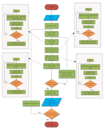 - The contaminated PD signal is then fed to an algorithm that applies the MODWT denoising, using random wavelet parameters (i.e., mother wavelet, level, wavelet scale, and combination of MRA).