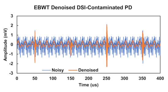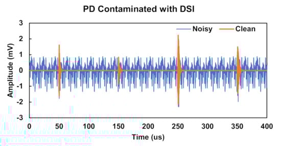 Figure 11 shows a sample of the simulated PD signal that was contaminated with DSI. The SNR, in this case, was 0.35 dB, whereas the NCC was 0.28. The denoised signal using MODWT is shown in Figure 12. The SNR, in that case, increased to 4.39 dB with an improvement of 4.04 dB. The NCC also increased to 0.79. It can be noted that the amplitude of the denoised pulses was slightly lower than the input signal. Likewise, applying EBWT on a different sample also yielded an improvement in SNR as shown in Figure 13. In this case, the SNR of the noisy signal was 0.35 dB and the SNR of the denoised signal shown in Figure 13 was 1.61 dB. Additionally, the input NCC was 0.28, and the output was 0.55. Nevertheless, the noise in the denoised signal appears to be lower. A careful inspection would reveal that the lower improvement in SNR and NCC values were due to some distortion in the PD signal’s amplitude and spectrum (can be seen in the second pulse at 150 s in the figure). Comparing the amplitudes of the PD pulses after denoising reveals that since the MODWT-based algorithm has a lower impact on the amplitude, it has an advantage in condition monitoring of insulation reflecting a more accurate indication of the severity of the PD.