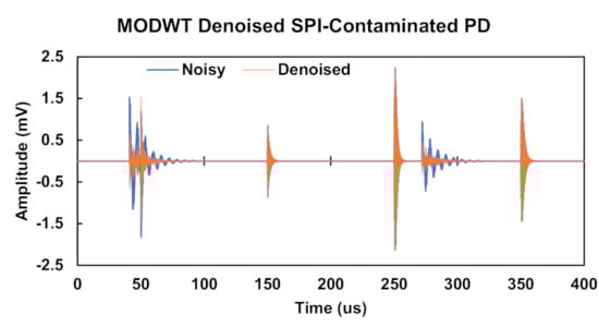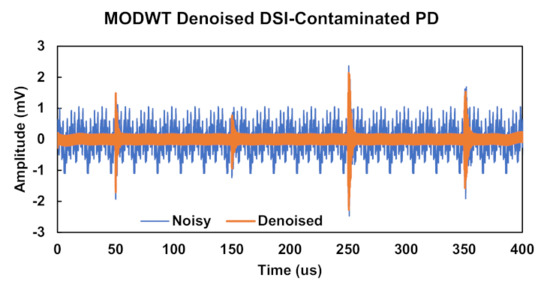 - Moreover, the MODWT-based algorithm had a small impact on the features of the signal (i.e., amplitude and spectrum). This proves advantageous in assessing the severity of the PD and hence, the condition of the insulation.