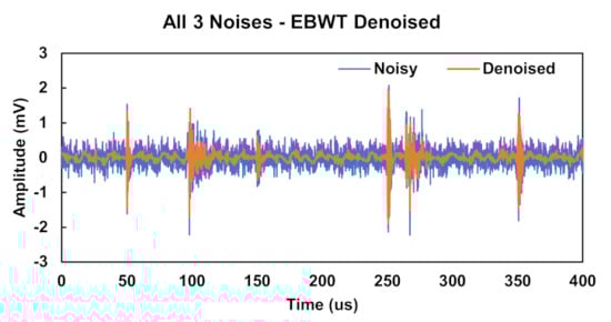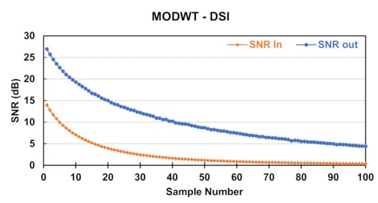 Finally, the performance of the proposed algorithm is compared to that of the empirical Bayesian wavelet transform (EBWT) algorithm, which is selected, as it is commonly used in such applications [34,35,36,37]. Similar to MODWT, EBWT is an algorithm that varies the parameters of the DWT (i.e., the mother wavelet, the wavelet scale, the thresholding rule, threshold method, the decomposition level, and the level dependency). However, EBWT differs from MODWT in that it uses the DWT to decompose and reconstruct the signal, while the MODWT uses the maximal overlap DWT. It is named empirical Bayesian WT since it uses the empirical Bayes thresholding method—by default—but is not limited to it. The EBWT is chosen to be compared to the MODWT, as it is considered a very wide form of DWT and applies most of the improved denoising methods to the signal (i.e., empirical Bayes, false discovery rate, minimax estimation, Stein’s unbiased risk estimate, block James–Stein, and universal threshold rule). It also handles most of the thresholding rules (i.e., soft thresholding, hard thresholding, mean, and median), which are varied repeatedly until the best output SNR is reached. Accordingly, EBWT can be regarded as multiple algorithms, which allows MODWT to be compared to the best of these algorithms.
