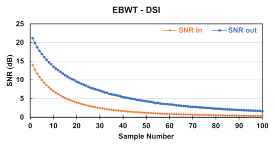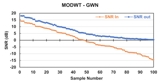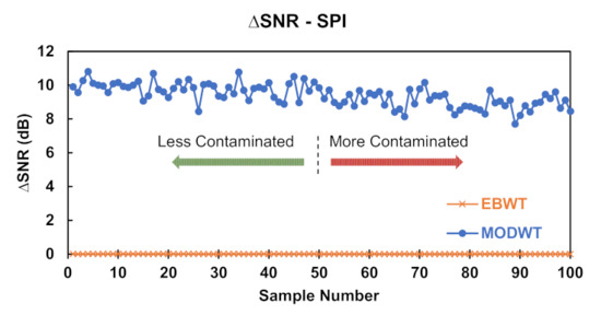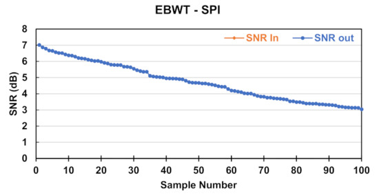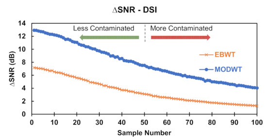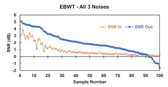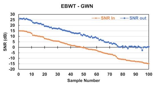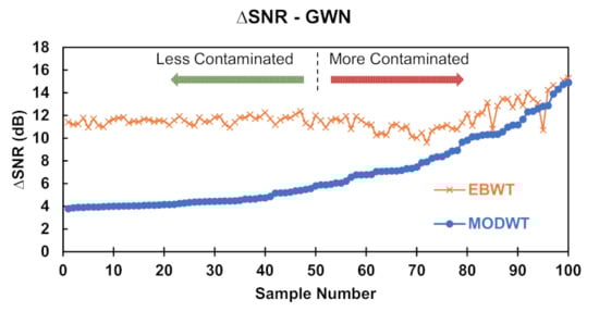 Inspecting Figure 14 shows that the maximum improvement was about 12.93 dB and the minimum was 4.04 dB, with an average of 7.89 dB. In comparison, applying EBWT reveals lower improvement in SNR values than MODWT, as the maximum and minimum were 7.17 dB and 1.25 dB, respectively. The average was 3.56 dB. In addition, comparing Figure 14 and Figure 15 shows that the performance of the EBWT algorithm declines more with heavy noise content, compared to the MODWT algorithm.