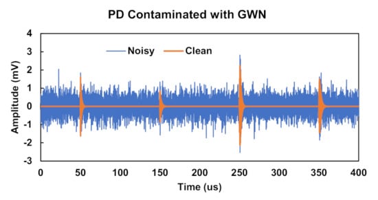 The main problem of the acquisition of PD signals on-site using any of the aforementioned methods is the presence of various types of noises that comes superimposed on the main signal. This makes utilizing the acquired signal in condition monitoring and diagnosis without any signal processing impossible. These noises can be narrow-band noises as well as wide-band noises. The most common noises found in sub-stations/power-stations are Gaussian white noise (GWN), discrete spectral interference (DSI), and stochastic pulse interference (SPI) [7,8,9,10].