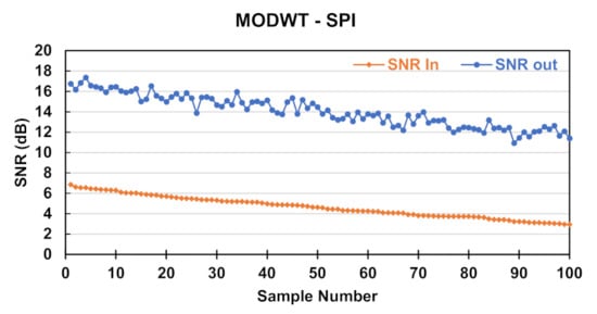 for both MODWT and EBWT. For most cases, the MODWT achieved better results. As the signal becomes more noisy, the MODWT holds positive results, while the EBWT decreases the signal SNR. Average for MODWT was 2.66 dB and for EBWT was 1.11 dB.
