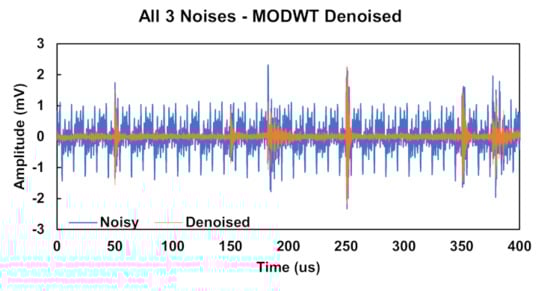 - In the case of concurrently existing noises, the MODWT algorithm achieved better results for both lightly contaminated and heavily contaminated signals.