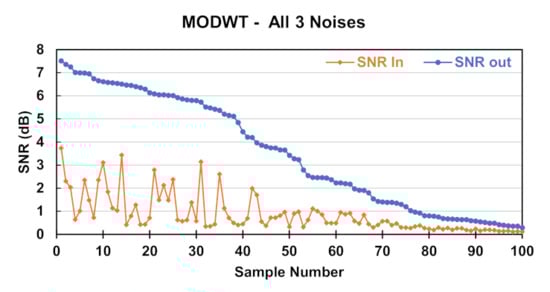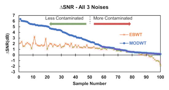 To further compare the performance of both algorithms, the values are combined in Figure 16. From this figure, it is obvious that the improvement in SNR values achieved by the MODWT-based algorithm is higher than that of the EBWT in all the studied cases. The performance for both methods decreased as the signal noisiness increased, but the MODWT performance remained in the lead.