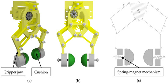 Gripper with thermoplastic polyurethane cushion-finger pads filled with MR fluid; (a) isometric view, (b) front view, (c) gripper kinematic schema.