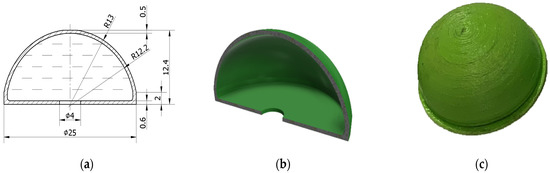 Further experiments have focused on the use of TPU because of its properties similar to flexible rubber. This material is also 3D printable. The printing tests conducted made it possible to obtain a monolithic, leak-proof cushion. In addition, long-term tests have shown that the MR fluid does not react with it even after several months of being inserted inside the cushion and sealed. The TPU cushion withstands repeated squeezing tests, showing tightness and resistance to wearing out. The geometry of the cushion is shown in Figure 2 and is based on a hemisphere with a diameter of 25 mm. The wall thickness varies between 0.5–0.6 mm. The basic parameters of FDM printing and TPU material are summarized in Table 1 and Table 2. The cushion is filled with MR fluid by inserting a syringe through the hole at the base, filling the assumed volume and gluing a TPU disc of 25 mm diameter and 0.4 mm thickness with cyano-acrylic glue. As a result, the thickness of the bottom of the cushion is approximately 1 mm.