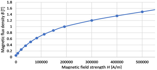 Nonlinear characterization of the relationship of the magnetic flux density B (T) to the magnetic field strength H (A/m) of the MRF-140CG [32].