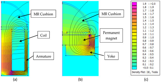 Comparative analysis of the determined magnetic flux density distributions in considered variants of the magnetic field excitation (shown in Figure 5) shows that in the case of the electromagnet excited system, the significant presence of the magnetic flux leakage can be observed (represented by the flux lines inside the coil area in Figure 5a not passing to the MR fluid container). In consequence, the magnetic flux density inside the cushion is relatively low and the magnetic field is not excited in the entire MR fluid volume. Moreover, the saturation of the yoke of the electromagnet can be observed.