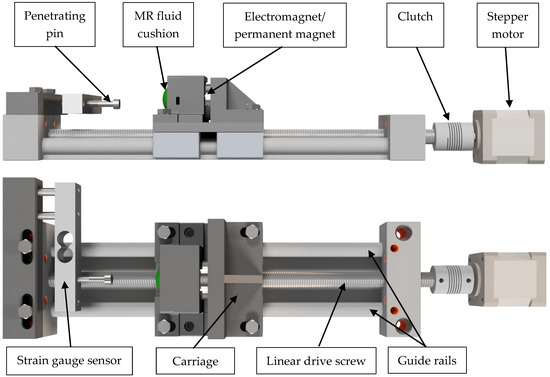 Grippers of rigid construction, on the other hand, can be equipped with fingertips on the jaws that allow for additional adaptation to the surface of the gripping element while maintaining the properties of the rigid construction. Tests of several such solutions have already been presented. The first one is the use of a rubber bag filled with gel and equipped in silicone layer [19]. Such a solution allows to grip both delicate and heavy elements of high rigidity. In this case, the gel is an intermediate layer between the rubber bag and the silicone sphere. At the approach of the jaw with the cushion to the gripped object, the gel, by its incompressibility, allows to grip with low stiffness, then the cushion adapts to the shape, and the contact stiffness increases. According to the authors, the fingertips exert a uniform contact force at low maximum pressure. Fingertips can be filled with viscoelastic fluid [20]. In order to separate the rigid jaws from the object and better match their surface to its shape, rubber pockets filled with air can be used [21]. In this solution, the authors presented a two-jaw parallel gripper design in which pockets of different shapes were placed on the jaws and filled with air, forming soft cushions. During the feasibility tests, they observed slight opening of the side plates, especially when pressure is exerted on the rubber side pockets, which is caused by the width and flexibility of the side panels (jaws). Such cushions can also be filled with MR fluid to create a miniaturized solution similar to the jamming gripper [22]. In this case, the source of the magnetic field is a permanent magnet pushed against the pad using a mechanism based on a spring in a holder moving on a motor-driven screw through a belt transmission. The authors used hydrogenated nitrile butadiene rubber (HNBR) embedded on an iron yoke and secured with a clamp on the elastic bladder. The range of motion of the magnet relative to the base of the pad allows for simultaneous introduction and removal of a magnetic field within the pad. Tests included attempts to grip objects of various shapes and to measure gripping force with and without magnetic field. It is also worth noting the benefits of inserting pads on the jaws. In addition to matching the geometry of the gripped object, they also influence the increase of contact area and frictional behavior [23]. The authors note the consideration of curvature and thickness in pad design and indicate that the best frictional, shear strength, and holding force at low loads is exhibited by the cubic finger pad. It is followed by the sphere geometry, which was chosen for the tests presented in this paper because of the distributions of the applied magnetic field sources. The previously mentioned parameters also allow for within-hand pose manipulation [24], i.e., performing sliding, gripping, and rolling moves of the object. The pads can furthermore provide information on object handling by equipping them with force/tactile sensors [25]. This makes it possible to enrich the gripper control system with coupling and gripping information, especially when considering the slipping control algorithm. In addition, the possibility of using feedback loops to control grippers [26] and entire manipulators [27] must be also taken into account. There are also MR sponge cell solutions. These are based on soaking a sponge in MR liquid and encapsulating it in a cling film. This allows the MR sponge to deform while retaining its flexibility and ability to return to its original form and thus be controlled by an external magnetic field source [28]. A derivative of MR liquid-based solutions are grippers using magnetorheological elastomers (MREs), or smart composites based on carbonyl–iron particles in a silicone rubber. These can be used, for example, to make gripper jaws that adapt to the shape of the object being gripped. In this case, the properties and behavior of jaws made from MREs are also influenced by the percentage of carbonyl–iron particles [29]. In particular, the article [30] provided inspiration for this research.
