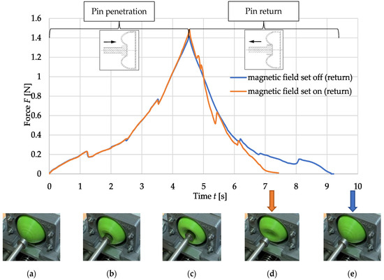 The test procedure is as follows. The pin attached to the strain gauge beam remains at rest. The cushion is in a holder, mounted on a carriage moving on a linear drive screw (Figure 6). During the first phase of movement, the cushion is positioned away from the pin and there is no contact between them (Figure 7a and Figure 8a). The carriage, together with the cushion, begins to move in a uniform rectilinear motion. The starting point of the force–time plot in Figure 8 corresponds to the initiation of contact between the cushion face and the pin; this situation is illustrated in Figure 8b. The maximum penetration of the pin into the cushion is shown in Figure 7b and Figure 8c. This state corresponds to the highest value of force recorded by the strain gauge beam observed in the force–time plot shown in Figure 8. At this point, there are two situations to be distinguished. The first, when the magnetic field is not introduced into the cushion (the waveform marked in blue), and the second, when the magnetic field is excited in the system (the waveform marked in orange). This allows to compare the effect of the field on the behavior of the MR fluid cushion. Figure 8d shows the effect of fixing the deformed shape of the cushion by the applied magnetic field. The recessed shape of the pin in the cushion is memorized, and pulling back the cushion shows the behavior of the imprinted pin shape. This can also be seen in the force–time plot, which illustrates a faster loss of contact and thus a reduction in the recorded load force. The situation shown in Figure 8e presents the absence of contact between the cushion and the pin in case of lack of a magnetic field. This is the end of the movement and measurement procedure.