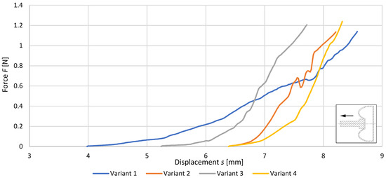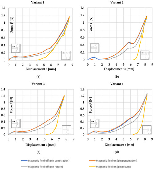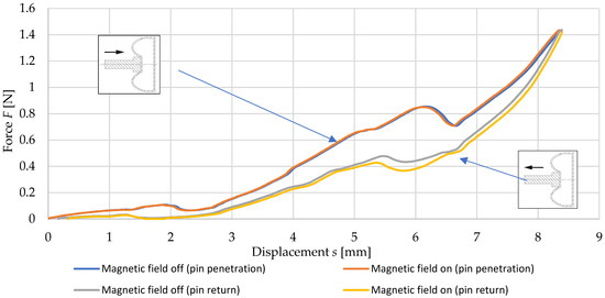 For further analysis, the recorded force–time characteristics are plotted as a force function of displacement, corresponding to the penetration recess in the cushion (Figure 9 and Figure 10). The maximum pin recess s in the cushion reaches 8.5 mm (Figure 7b). The cushion behavior is not affected much by the electromagnet, as shown in Figure 9. The volume of fluid or the presence of air in the cushion is not relevant in this case. The following result of the experiment confirms the results of the preliminary FEA described in Section 2, which shows low magnetic flux density in the cushion volume (Figure 5a). Therefore, further analysis focuses on the use of the magnetic holder (Figure 5b).