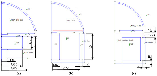 Excluding the electromagnet as a source of magnetic field, the authors focused on developing a solution based on a permanent magnet. Taking into account the results of the tests to penetrate the pin into the cushion, it was therefore decided to carry out FEA of three magnetic holders of different sizes and shapes, denoted as model A (Figure 12a). Dimensions of permanent magnet of considered variants of model A are as follows: (a) fi29 × 10 mm, (b) fi20 × 13 mm, and (c) fi19 × 8 mm. The studied variants are based on shapes of the armature (see Figure 13a–c, respectively). The diameter of the variant denoted as (a) is larger than the cushion and, consequently, the armature, in which the magnet is located, protrudes beyond its outline (Figure 13a). The magnetic field lines coming out of the center of the magnet must pass through the MR fluid and the wall of the cushion to close. In the other two cases, the field is confined within the face of the cushion and does not extend beyond its walls. The holder in Figure 13b has a magnet with the same diameter as the holder in Figure 13c, except that it is 1 mm lower. Another key difference having impact on the magnetic field distribution between variants (b) and (c) is the geometry of the armature. The thicker armature on the bottom part of the magnetic circuit of variant (c) has a larger cross-sectional area, which is revealed by its lower saturation compared to the corresponding thinner armature of variant (b). On the other hand, all armatures have a common disadvantage, which is associated with the close proximity of the upper part of the yoke and the magnet. As it was mentioned when analyzing magnetic field distribution shown in Figure 5, the highest magnetic flux density can be observed at the border of the mentioned elements, i.e., between magnet edge and upper armature, at the bottom of the cushion. Thus, the field reaching the fluid inside at higher distances from the bottom of the cushion is relatively weak. To increase the magnetic field density at higher distances from the bottom of the cushion, an analysis of the application of the author’s solution, considering of additional air gap between the magnet and a yoke, is needed.