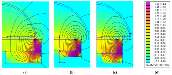 FEA results for model A; (a) magnetic mount fi29×10, (b) magnetic mount fi20×13, (c) magnetic mount fi19×8, (d) magnetic flux density scale in color representation.