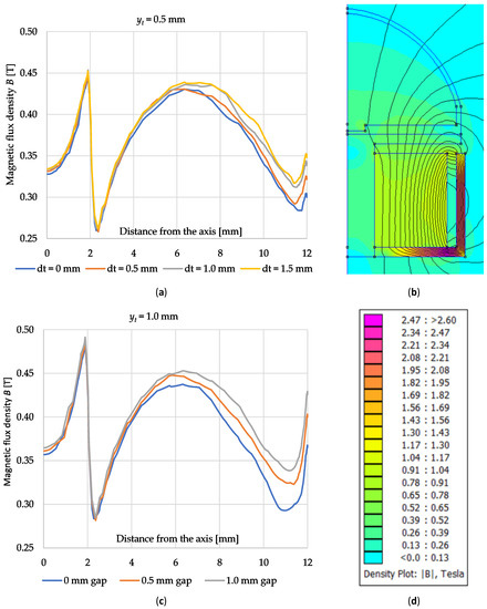 FEA results for model B; (a) magnetic flux density characteristics as a function of distance from the axis in the plane 0.1 mm above the bottom of the cushion for yt = 0.5 mm, (b) magnetic flux density distribution for dt = 1.0 mm and yt = 1.0 mm, (c) magnetic flux density characteristics as a function of distance from the axis in the plane 0.1 mm above the bottom of the cushion for yt = 1.0 mm, (d) magnetic flux density scale in the color representation.