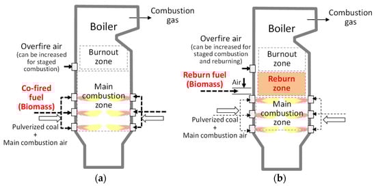 Conceptual diagram of the biomass cofiring and reburning in a pulverized coal boiler: (a) biomass cofiring; (b) biomass reburning.