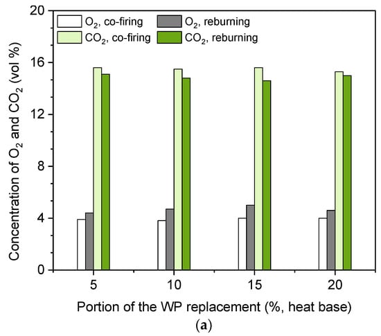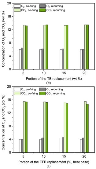 In all experimental cases, we checked combustion performance before discussion about NOx emission. Figure 3 shows concentrations of O2 and CO2 in the flue gas at furnace exit for various fuels, ratios of fuel replacements, and methods of fuel replacement (cofiring and reburning). In cases of WP (Figure 3a), we see that an almost similar value of O2 leads to a similar value of CO2 in cofiring cases. However, the O2 and CO2 concentrations of reburning cases show different behavior. This, for example, means lower CO2 is linked with higher O2, which leaves us with the conclusion that lower fuel is converted to energy. It also must be emphasized that the amount of CO for all cases is zero. Therefore, higher O2 and lower CO2, in some cases, suggest energy loss due to unburned carbon. In turn, it could be concluded that cofiring technology leads to slightly better fuel conversion than reburning technology, since cofiring cases led to lower O2 and higher CO2 when WP is utilized. Figure 3b shows the O2 and CO2 at furnace exit for TB cofiring and reburning. It reveals that almost the same level of O2 at furnace exit for both the cofiring and reburning cases leads to almost same level of CO2. Therefore, there is no significant difference between level of fuel conversion rate in the case of TB cofiring and reburning. However, in cases of EFB reburning (Figure 3c), CO2 concentration is decreased by 1% for higher replacement ratio, while there is no significant change for cofiring cases. The figure reveals higher CO2 and lower O2 in cofiring cases, which implies higher carbon conversion (combustion efficiency) compared with reburning cases. The same conclusion also has been driven for WP cases. For TB, however, the fuel conversion of both cases has been quite similar.