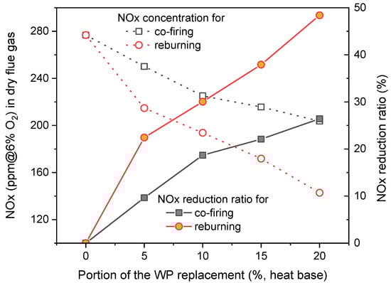 NOx emission and degree of NOx reduction for various WP cofiring and reburning ratios.