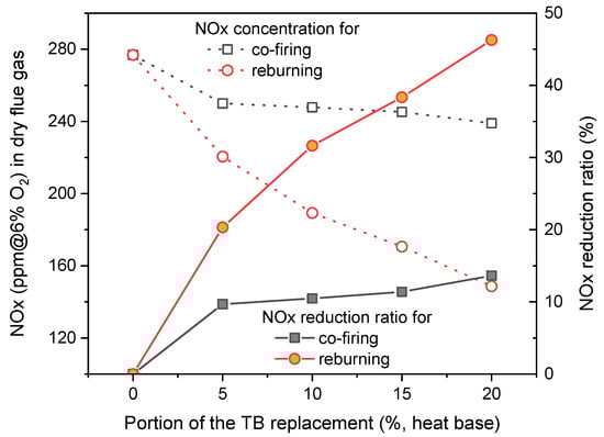Another important discussion could be developed by comparing Figure 4 with Figure 5. As it has been said in the previous paragraph, the NOx reduction capability of TB in reburning technology is, by far, higher than cofiring technology. The explicit numbers of 20% to 46% NOx reduction capability in reburning technology versus 9% to 13% NOx reduction in cofiring technology when the fuel substitution varies from 5% to 20% proves the significantly different performance between the two technologies. On the other hand, Figure 4 shows almost parallel black and red lines for the WP replacements of 5 ~ 20%, which implies there might be a relation between NOx abatement capability of biomass in reburning and cofiring technologies. However, Figure 5 rejects such a hypothesis. Indeed, biomass cofiring and reburning technologies abate NOx through totally different mechanisms. In cofiring, the emphasis is on higher volatile matter of biomass compared with coal. This higher volatile matter changes the heating rate and ignition behavior of coal. This, in turn, leads to shifting more fuel-N toward volatile-N, as opposed to char-N. Volatile-N, which is usually in forms of NH3 and HCN, has NOx abatement capability in an oxygen deficient environment []. In reburning, on the other hand, the emphasis is on the shifting of fuel from the primary combustion zone to the higher levels, in order to make a locally fuel-rich, oxygen-deficient region. Such a region produces CHi and C–O fragments, which could be partnered with NO and, finally, lead to N2 through chain reactions. Therefore, unlike cofiring, reburning technology does not necessarily require a high volatile matter fuel. It is very interesting to see that TB as cofiring has a much lower NOx abatement capability than WP (comparison between continuous black lines in Figure 4 and Figure 5). However, as reburning fuel, TB and WP have quite similar NOx reduction performance in Figure 4 and Figure 5. To be explicit in numbers, increasing the reburning ratio from 5% to 20% reduces NOx from 220 ppm to 149 ppm for TB and from 214 to 140 for WP. That is while TB has a higher fuel ratio (i.e., 0.361 versus 0.080) and lower volatile (70.9% versus 83.9%). The slightly higher NOx emission in TB might be due to the much higher fuel ratio. This clearly shows that reburning is less sensitive to fuel ratio, volatile matter, and ignition behavior of fuel compared to cofiring technology if a quite large retention time in the reburn zone is applied (around 1.5 s in this study). The issue of residence time becomes important when it comes to the dependency of NOx abatement on reburn fuel characteristics. It is logical to assume high volatile fuels with higher heating rates need less time to liberate all of their NOx reduction agents compared to low volatile fuels. However, when the residence time becomes large enough, the influence of volatile matter becomes blurred. Previous research [,,,] emphasized on the importance of volatile matter of reburn fuel have applied smaller residence time: 0.4 s, 0.5 s, 0.6 s, and 0.8 s, respectively.