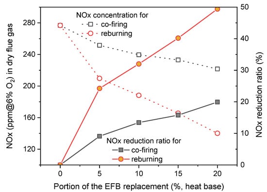 Another discussion could be established by comparing results of cofiring and reburning in all three biomasses. On the cofiring side (comparing the continuous dotted line in Figure 4, Figure 5 and Figure 6), 5% to 20% WP, TB, and EFB cofiring leads to NOx reduction from 250 to 203, from 250 to 239, and from 251 to 222, respectively. On the reburning side (comparing the dotted red line in Figure 4, Figure 5 and Figure 6), 5% to 20% reburning leads to NOx reduction from 214 to 140, from 220 to 149, and from 210 to 140 for WP, TB, and EFB, respectively. It is clear that altering fuel leads to significantly higher variation in NOx reduction for cofiring cases than reburning cases. Indeed, altering fuel in reburning technology leads to quite a similar amount of NOx reduction. That is while EFB has a fuel ratio three times higher than WP and fuel-N lower than WP and TB. Therefore, it could be concluded that reburning technology with regard to NOx reduction is less sensitive to fuel type than cofiring technology.