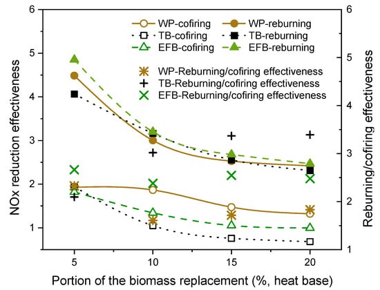 NOx reduction effectiveness and effectiveness ratios of reburning over cofiring for various types and replacement ratios of the biomasses.