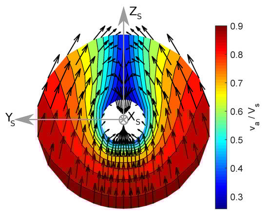 A cyclic varying pitch (CVP) propeller is a propeller for ship propulsion that can pitch the propeller blades cyclically, i.e., the propeller pitch may follow a given trajectory for a single revolution. On the contrary, conventional propellers currently used for ship propulsion are fixed-pitch (FP) propellers or controllable pitch (CP) propellers. Both these propellers have a fixed pitch for a given revolution, but the pitch angle may change simultaneously for all blades for the CP propeller. Thus, the propeller placement behind the ship hull means that the flow through the propeller is non-uniformly distributed. This non-uniform flow field is also called the wake field of the ship, and an example is seen in Figure 1 for a single screw propeller. The wake field in the figure is normalized relative to the ship’s speed, , where is the velocity of the incoming water along the forward direction of the ship (usually termed the local advance velocity). From Figure 1, we can see that the velocity distribution varies radially and circumferentially. A minimum of the fluid velocity is around the top of the wake field, i.e., the 12 o’clock position, and the maximum is around the bottom of the wake field, i.e., the 6 o’clock position.