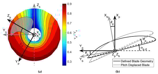 Here, is the transformation matrix from the ship to the propeller coordinate system and is the transformation matrix from the propeller to the blade coordinate system. The transformation matrices and are determined as the inverse of the transformation matrices and , respectively. is the i’th blades position in the wake field, as shown in Figure 3a. is the i’th blades pitch displacement relative to the design pitch of the blade, as shown in Figure 3b. The pitch of the CVP propeller blades varies cyclically with the blade’s position in the wake field. The cyclic varying pitch trajectory () of the propeller blades is described with a Fourier series as: