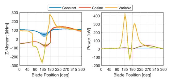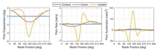 To apply the model, the propeller considered in [8,11,12] is used. In [8], three pitch trajectories are determined for the CVP propeller using a quasi-steady analysis method. The Fourier series approximations of pitch displacement, pitch rate and pitch accelerations for these pitch trajectories are shown in Figure 6. The blade position in Figure 6 is the blade’s position in the wake field, as defined in Figure 3a. Therefore, the blade is in the low-velocity part of the wake field around a blade position of . In [8], the three pitch trajectories; “Constant”, “Cosine” and “Variable” are determined. The variable pitch trajectory is determined iteratively using a quasi-steady lifting line approach, whereby variation in the blade thrust and transient cavitation is almost eliminated while maximizing the efficiency. The cosine pitch trajectory is the best pitch trajectory containing a single first-order harmonic, which reduces the variations in the blade thrust and maximizes the efficiency relative to the constant pitch trajectory. The constant pitch trajectory is equivalent to the operation of the CP propeller. Furthermore, in [8], the geometry of the propeller blade is adapted for each of the pitch trajectories to obtain optimum performance of the propeller. However, the current paper uses the propeller blades’ original geometry for all three pitch trajectories. Therefore, the difference in the loads is only due to the pitch trajectory.